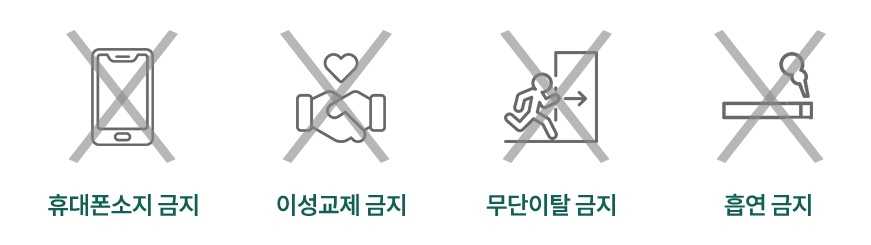 | 엄격통제 | 기숙실에서의 취사행위, 화재를 일으킬 수 있는 행취, 음주, 도박, 고성방가 등으로 타인에게 피해는 주는 행위는 엄격히 통제됩니다. |