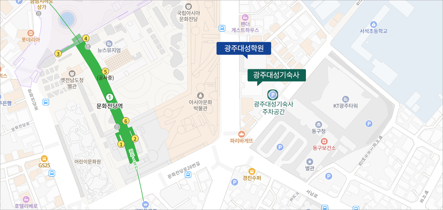 | 문화전당역 남 (구동청 앞 도보 3분 거리) |
